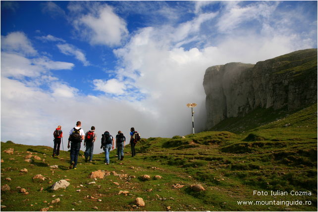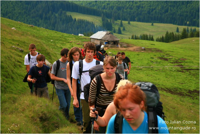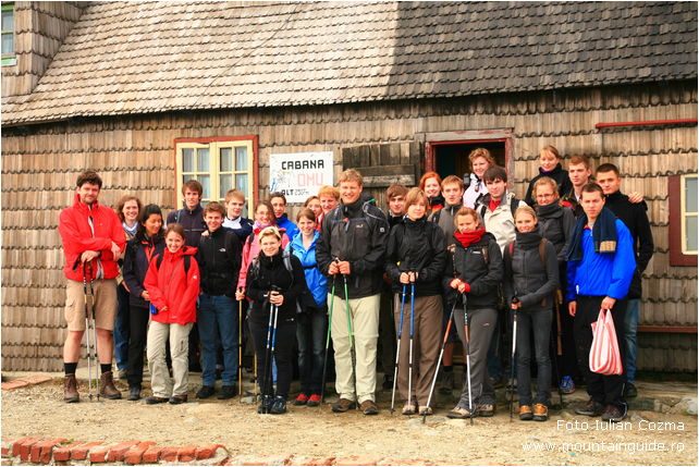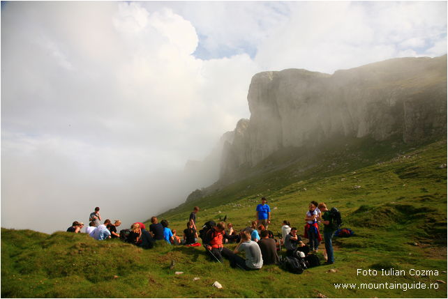 Hello! You may find below some images from a 2 days tour, when I traverse Bucegi mountains with a group of students from Albert-Schweitzer-Gymnasium, from Erlangen town, from Germany. The original plan was that we will go up to Bucegi mountains by the cable car from Busteni, but our plans were ruined by the cable car station from Busteni who was broke again … So next morning we travel to Sinaia Cota 1400’s by 2 small buses, and here we were very lucky because we catch the cable care up to Cota 2000 from Sinaia, where we start our walk to Omu peak. I can say that even we were 28 persons in the group, 2 teachers of Geography from Albert-Schweitzer-Gymnasium, me as a guide and 25 students, we move very quickly 😉 From Sinaia Cota 2000 to Omu peak, 2507 m high, we walk in 3 hours and 20 minutes 😉 what is a very very god timing 😉 I can say that after this slow running some persons from the group were quite tired but also happy! The weather at Omu peak was ok, offering us some nice views to Costila peak and Gaura valley. After a break for a tea, soup and more, we start the descent to Pestera valley, where we spent our night. On the next day we traverse Bucegi mountains from Pestera valley to Moeciu de Sus, over Saua Strunga saddle. Until Saua Strunga saddle the weather was nice and warm. Up on Saua Strunga saddle we just find a wall and a sea of clouds over all Transylvania and our luck with good weather end in few minutes 😉 We had some rain, but not very bad, and finally we arrived safe and happy in Moeciu de Sus village, ready to visit Bran catsle museum!