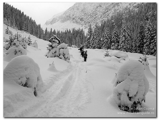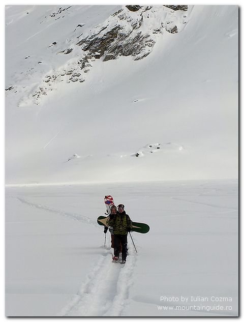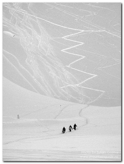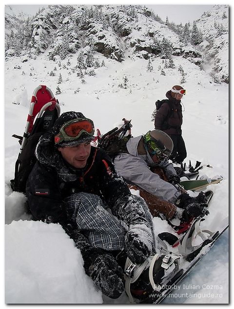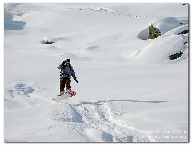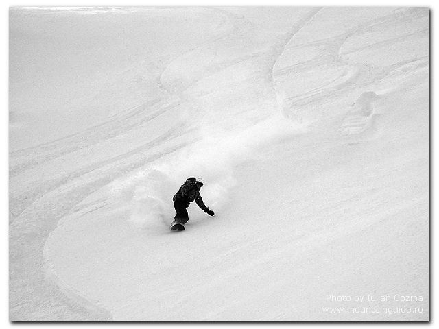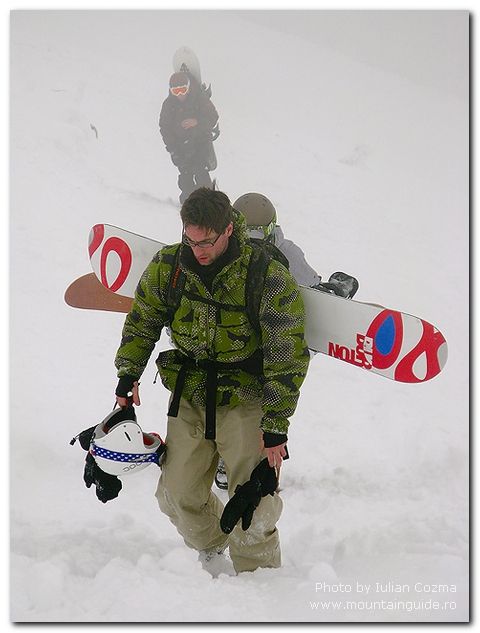 This week of February 2009 was maybe not the best for snowboarding, but some days were great. Powder snow and visibility at Balea Lake in Fagaras mountains, give us the possibility to have some nice rides on Balea valley or on Lady valley. The tours before Fagaras mountains were in Poiana Brasov and Ciucas mountains. The snow was great but the wind and fog were quite heavy, so the pleasure was not at maximum. After Fagaras mountains we drive to Sinaia ski resort, and unfortunately for 2 days we were on lower clouds, without too many options for riding. But even with this unfriendly weather, just being snowshoeing on nature was a great experience!