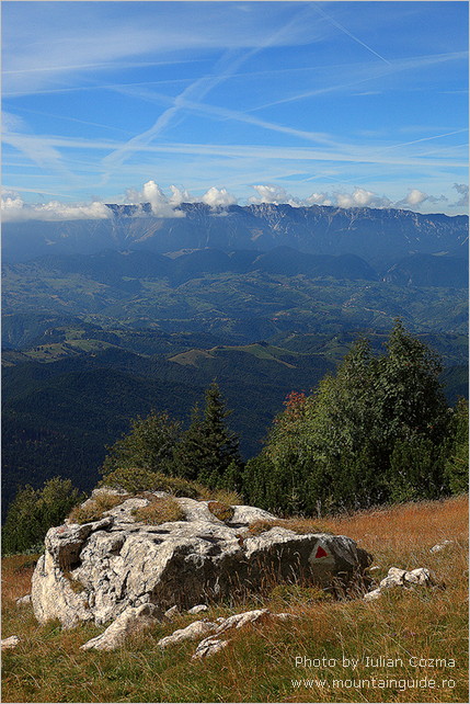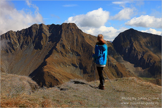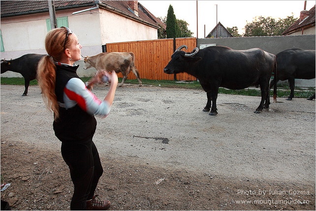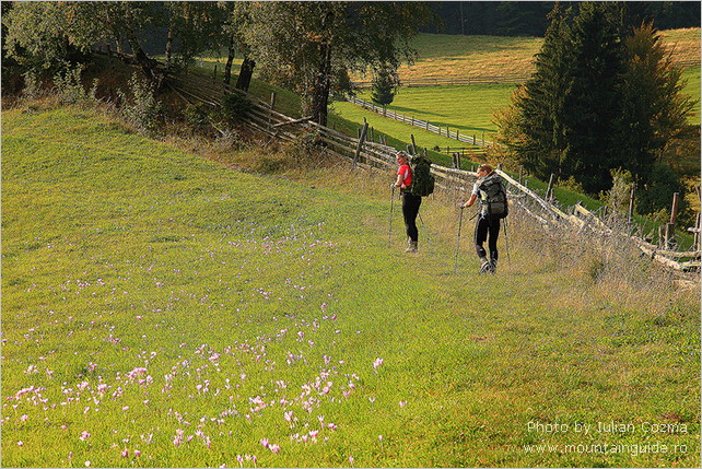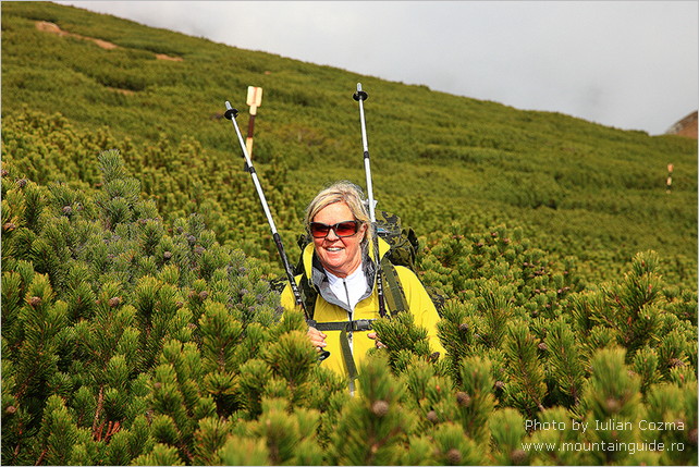 På den første dag , i Bucegi Bjergene , skinnede solen fra en skyfri himmel – og det fortsatte den med resten af ugen . Fra Sinaia tog vi tovbanen 700 m op til vi var over trægrænsen . Her var goldt og koldt , så vi måtte have handsker og huer på. Vi gik 300 meget lange meter op til Omu Peak . Hvor vi , foran en lille hytte hvor man kunne købe suppe , kaffe og meget sød te , nød udsigten udover bjerget . Vi følte os klar til en en uges dejligt hård bjergvandring ! Desværre blev et dårligt knæ genoplivet af en lidt lang tur ned af bjerget , så det stod os klart at vi ikke ville kunne fortsætte ugen med de samme ambitioner som først antaget. Modstræbende måtte vi sige dette til Iulian ! Det accepterede han bare uden videre og i løbet af fem minutter havde han i sit erfarne hoved lagt lettere ruter til os , booket nye pensioner og aflyst andre som ikke passede ind i den reviderede plan . Desuden gav han os dagen efter en hvile og sightseing dag i Brasovs gamle , hyggelige bydel . Her viste det sig at han ikke bare ved noget om bjerge men også om Rumæniens historie , kultur og ikke mindst kager ! Vi blev fyldt med kager , mens vi nød godt af Iulians , sjove og vidende selskab. Dagen blev rundet af med et endnu et par hjemmebagte kager , som Iulians meget søde kone syntes vi skulle have med hjem til hotellet ! Sikke en dag ! I løbet af resten af ugen fik vi vandret i en masse skønne bjergområder , overnattet i de hyggeligste pensioner , og desuden på et utroligt hotel , Balea Lac , ude i en spejlblank sø , højt oppe i Fagaras bjergene, som er lidt mere golde men alligevel særligt spektakulære. Vi så gemser i elegant firspring nedover bjergskråningen . Vi så masser af ravne . Vi fik følgeskab en hel dag af en meget sød hund . Vi fik friske valnødder af en gammel hyrde og sidst men ikke mindst , tog Iulian os med til sin bedstemors landsby . Her overnattede vi hos hendes søster , fik en lang og fantastisk hyggelig snak med Silvio , en uforglemmeligt venlig mand som viste os alt . . Grisene , hønsene , kartoflerne (de små til grisene ! ) og , hans stolthed – værktøjet , samt hatten han har på til jul. Vi så køerne komme hjem fra engen ved solnedgang og blive malket , på den gode gammeldags måde . Vi fik dejlig hjemmelavet mad , brændevin , en masse kaffe og nykogte blomme knødeln . Vi følte os yderst privilegerede over at have fået lov til at få denne oplevelse , den satte et glad smil på vores ansigter som endnu ikke har fortaget sig ! Alt i alt var det en tur vi kun kan anbefale . I bjergene følte vi os fuldstændigt trygge med Iulian som guide . Desuden er Iulian er ikke bare professionel til fingerspidserne men også godt selskab og en god kammerat . Alt forløb som det skulle , lige fra vi ankom og blev hentet i lufthavnen af Iulians meget rare chauffør , Manu , til Manu satte os af en uge senere i lufthavnen . Med os havde vi hver en cd med billeder fra ferien som Iulian lige havde nået at brænde og aflevere på vores hotel aftenen inden . Effektivt og imponerende . Turen gav os stor appetit på at komme tilbage og se mere .